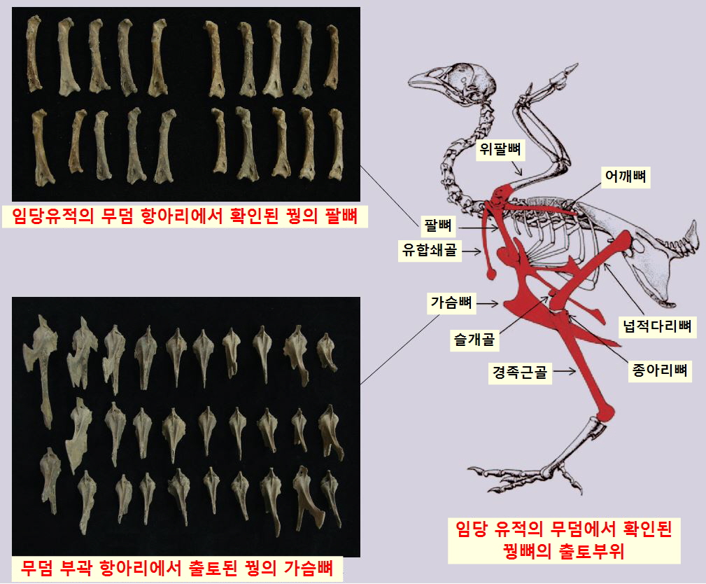 또 하나 재미있는 유물이 꿩뼈이다. <삼국유사> ‘태종춘추공’조는 “태종 무열왕 김춘추(604~661, 재위 654~661)가 하루에 쌀 3~6말, 꿩 9~10마리를 먹었다”고 기록했다. 그런데 임당유적에서 5세기 초반에 축조된 한 무덤의 부곽에서 꿩 70마리분을 담은 항아리가 확인됐다. 주인공이 묻힌 주곽(으뜸덧널)에는 금동관과 금동허리띠 같은 최고급 유물(조각)이 들어 있었다. 무덤 주인공은 훗날의 태종 무열왕처럼 무지무지 꿩을 좋아했던 지역지도자였음을 알 수 있다.