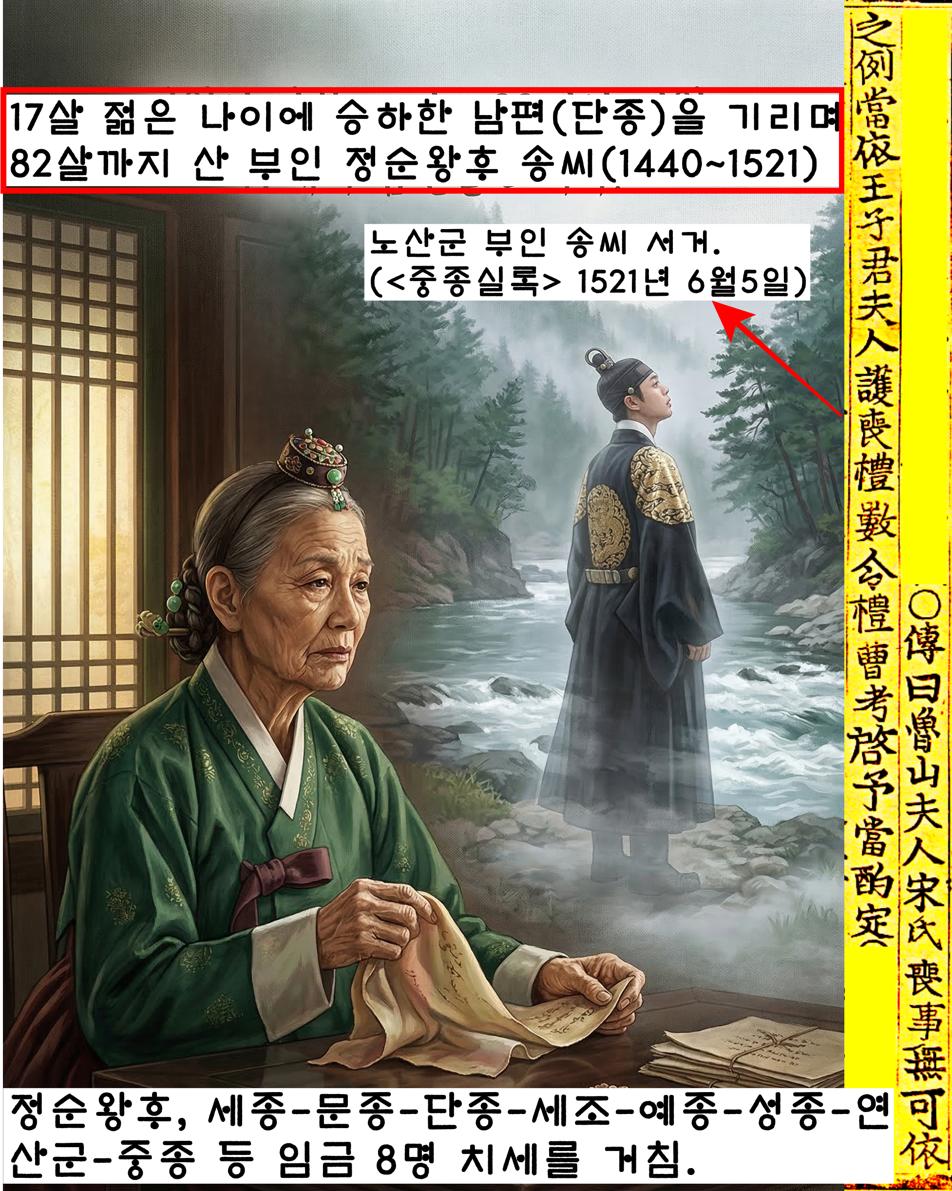 단종은 17살 어린 나이에 죽었지만 부인 정순왕후 송씨는 남편을 그리워하며 무려 82살까지 살았다. 세종 때인 1440년 태어난 송씨는 문종-단종-세조-예종-성종-연산군-중종 등 임금 8명의 치세를 살았다.