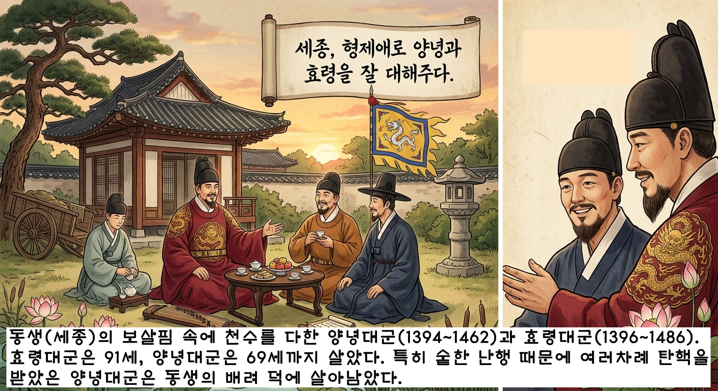 외삼촌은 물론이고 조카들도 모자라 조카의 아들까지 죽이라고 앙앙불락하던 양녕대군이다. 양녕대군은 세자위에서 쫓겨난 뒤에도 동생 세종의 인내력 깊은 보살핌 끝에 69살까지 살았다.