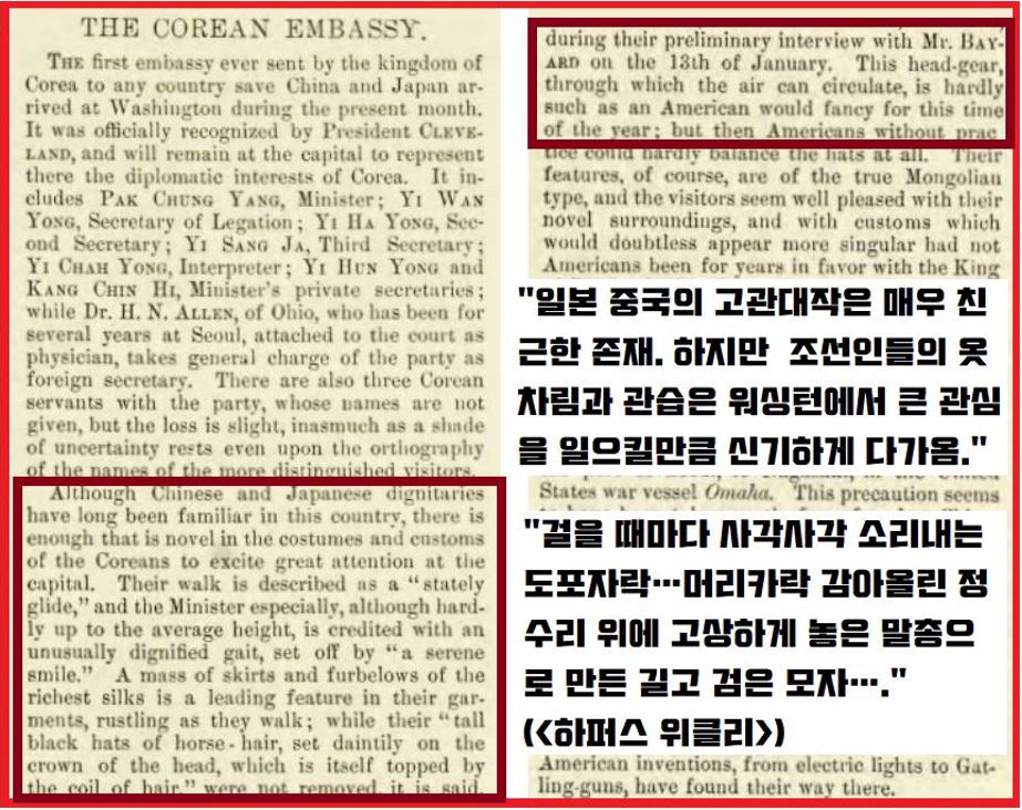 워싱턴 사교계 데뷔기도 흥밋거리입니다. 박정양 공사가 파티에 모인 여인들을 보고 “저 여인들은 기생들이냐”고 물었답니다. 수행한 알렌이 큰일날 소리라는 듯 “저 여인들은 미국에서 가장 저명한 부인들이자 딸들”이라고 손사래쳤다는군요. 그런 낯선 환경 속에서도 공사 일행은 우아하고 평온한 미소와 함께 사뿐사뿐 걸었답니다.(<하퍼스 위클리>)