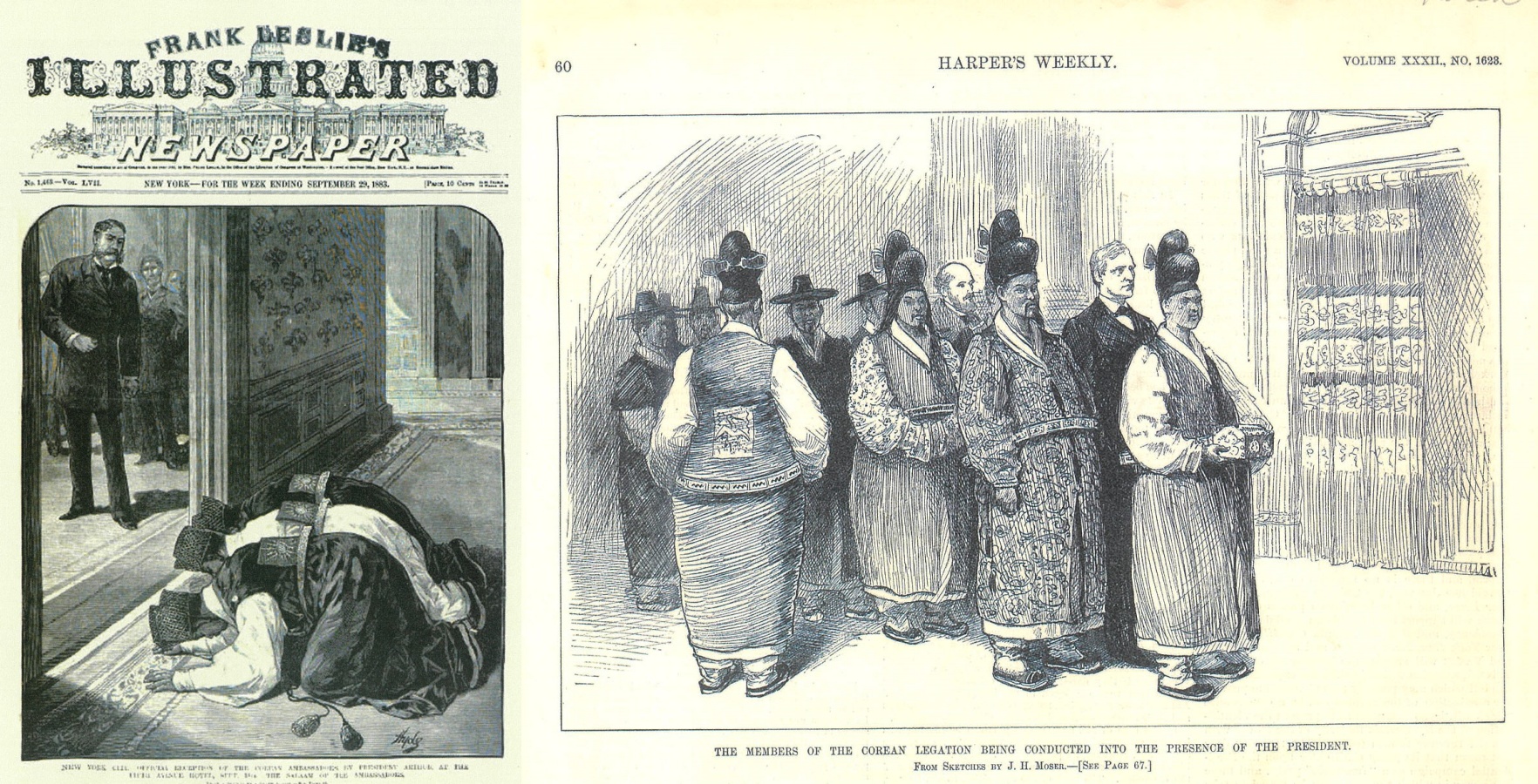 우여곡절 끝에 업무를 시작한 초대 공사일행은 워싱턴 정가를 발칵 뒤집어 놓았답니다. ‘걸을 때마다 사각사각 소리내는 풍성한 도포자락과 말총으로 만든 모자(갓)을 쓴 조선외교관들의 모습’(<하퍼스위클리> 1888년 1월28일자)이 화제를 뿌렸습니다.
