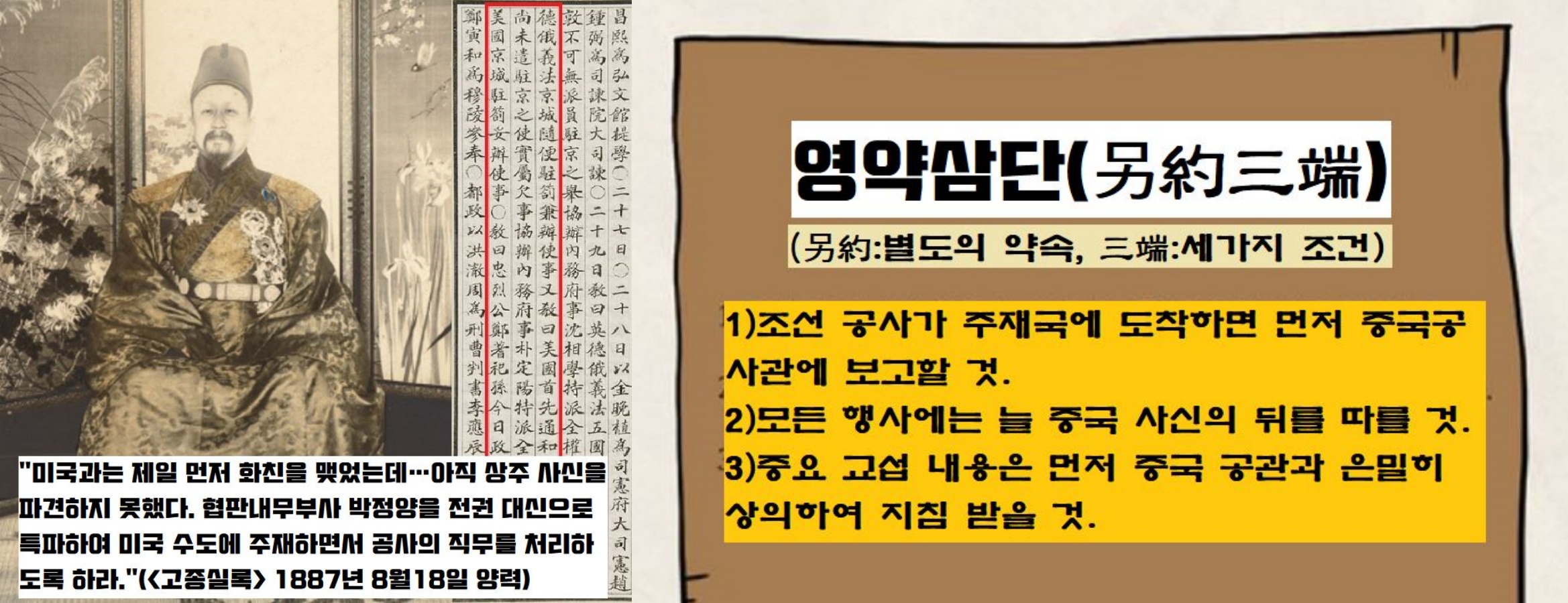 청나라는 “청국의 속방인 조선이 각국에 사절을 파견하려면 먼저 (종주국인) 중국의 인준 받아야 한다”고 고집했습니다. 그러나 미국이 그런 조건을 받아들였겠습니까. 공관 설립자체를 반대할 수는 없었죠.
