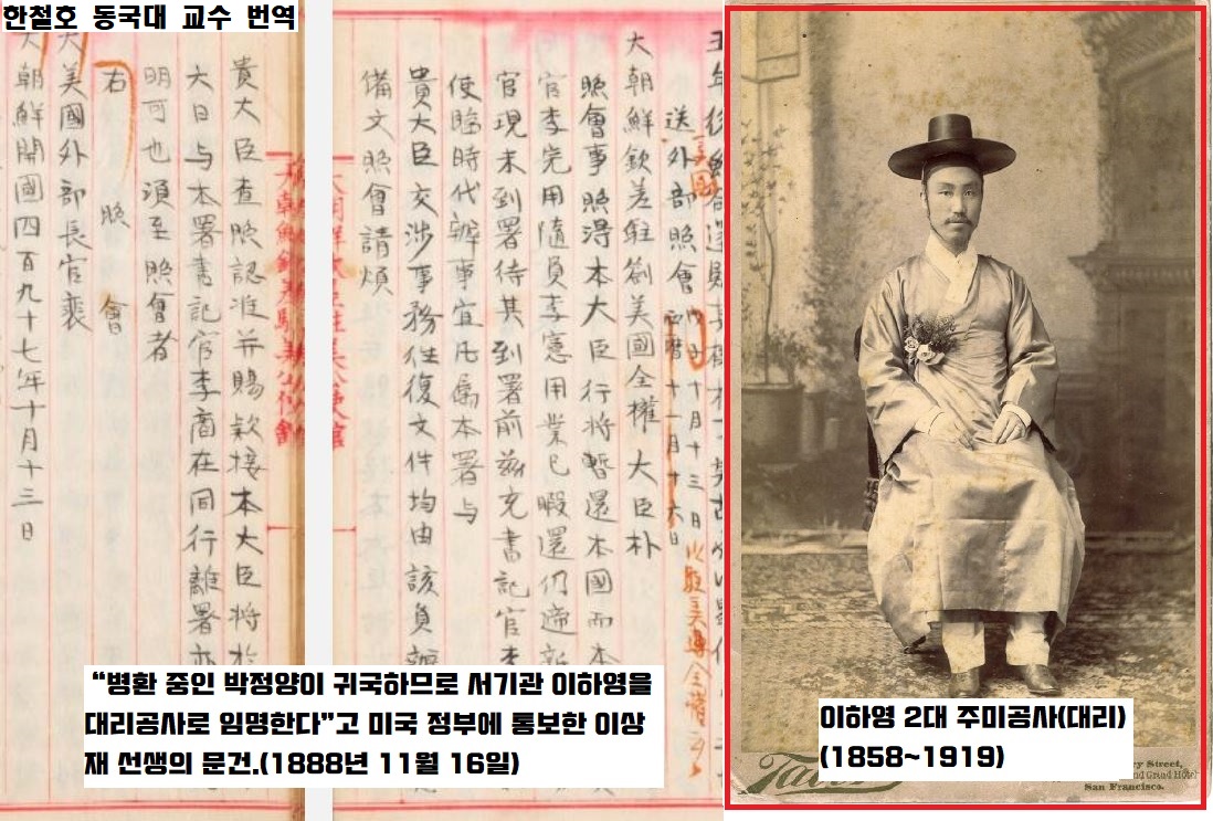 박정양 공사는 청나라의 끈질긴 경질압력 때문에 부임 10개월 남짓만에 경질되고 맙니다. “병환 중인 박정양이 귀국하므로 서기관 이하영을 대리공사로 임명한다”고 미국 정부에 통보한 문건(1888년 11월 16일)이 보입니다.