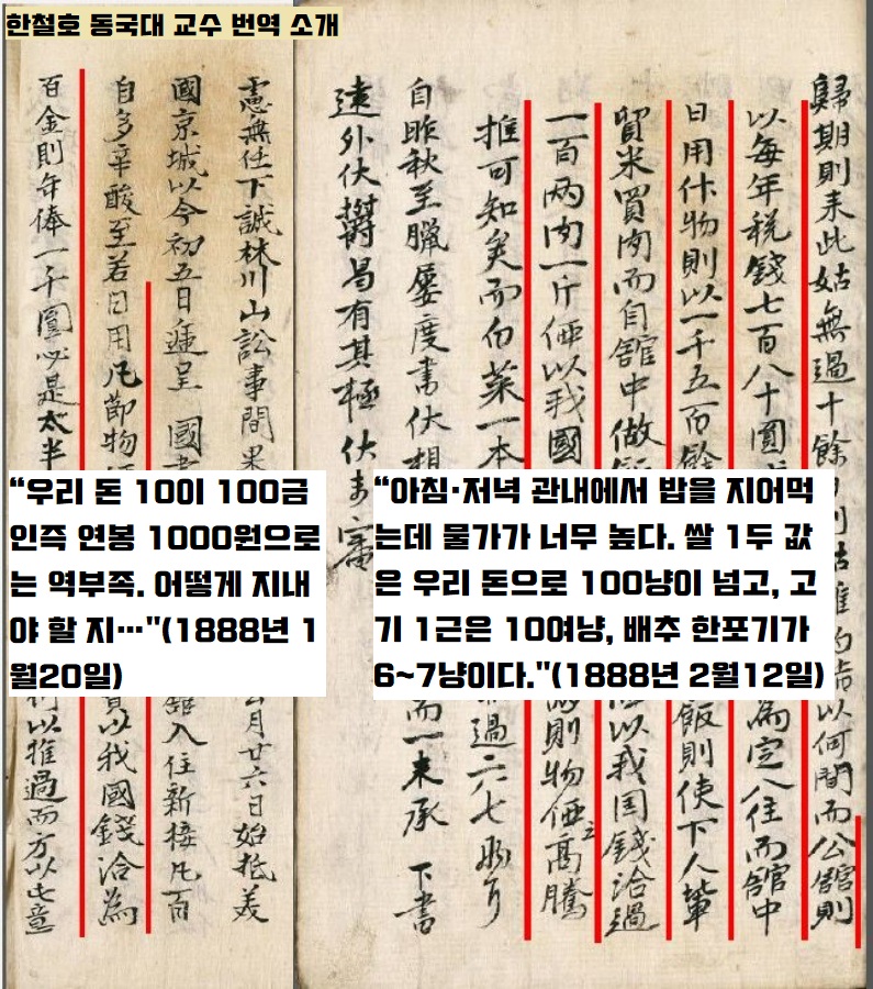 낯선 환경과 부족한 예산도 걸림돌이었습니다. “우리 돈 10이 100금인즉 연봉 1000원으로는 역부족인데 어떻게 지내야 할 지 모르겠다”(1888년 1월20일)고 했고, “아침·저녁을 쌀과 고기를 사서 관내에서 밥을 지어먹는데 물가가 너무 높다”(1888년 2월12일)고 하소연했습니다. 그런 와중에서도 외교관들은 조선을 위해 열과 성을 다했습니다.