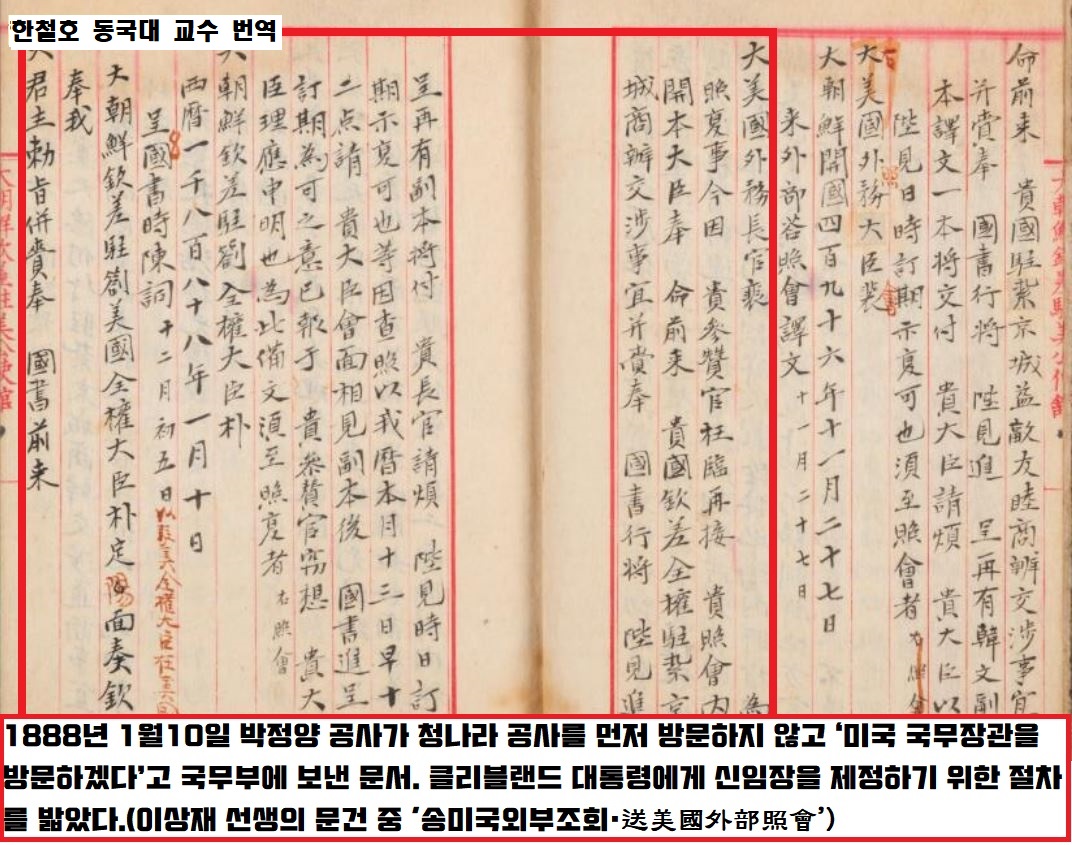 하지만 1888년 1월 워싱턴에 도착한 박정양·이상재 등 초대 주미공사 일행은 처음부터 이 영약삼단을 지키지 않습니다. 이상재 선생의 문건 중에 ‘송미국외부조회(送美國外部照會)’(1888년 1월10일)가 주목을 끕니다.