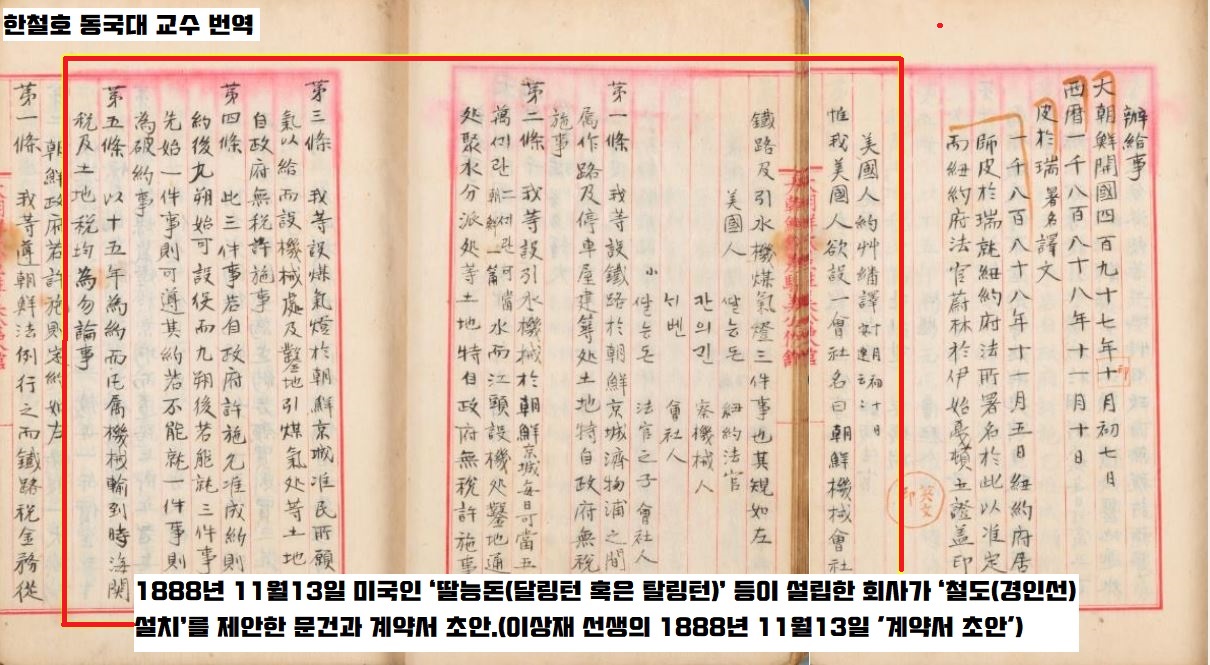 이상재 선생의 소장 문건 중에 1888년 11월13일 미국인 ‘딸능돈(달링턴 혹은 탈링턴)’ 등이 설립한 회사가 ‘철도(경인선) 설치’를 제안한 문건과 계약서 초안이 수록되어 있는데요. ‘경성~제물포 노선 철도’를 건설하는 계약기간은 15년이며, 15년 후 재약정 여부를 가린다’는 내용이 포함되어 있습니다. 한마디로 말해 철도부설권을 미국에 준다는 내용이었습니다.