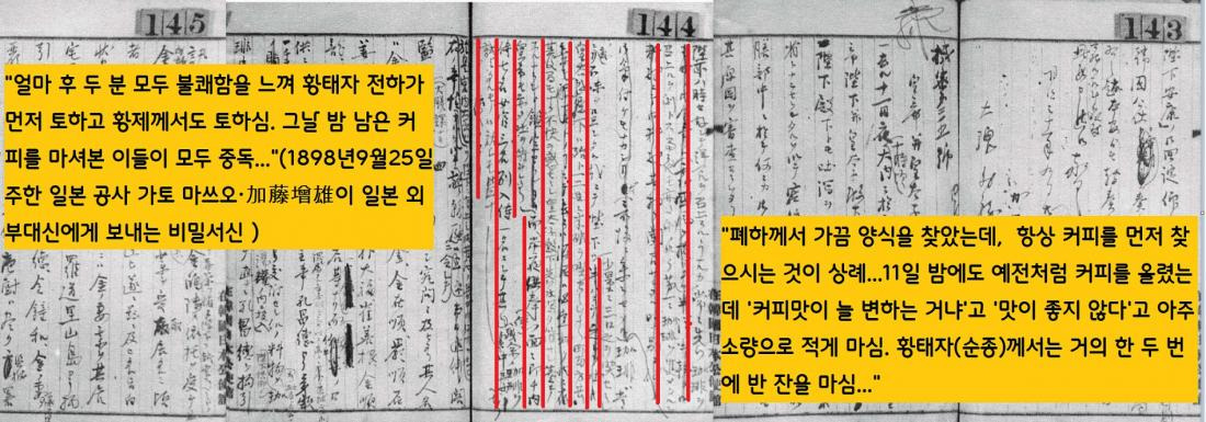 그날도 고종은 식전에 커피를 입에 갖다댔다. 그런데 맛이 좀 달랐다. 고종은 “커피맛이 늘 변하는 거냐”고 인상을 찌푸리면서 두 세 모금 찔끔 마신 뒤 잔을 내려놓았다. 그러나 황태자(순종)는 한 두 번에 걸쳐 커피 한 잔을 들이켰다.