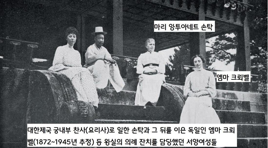 대한제국 왕실의 찬사(요리사)로 일한 마리 앙투아네트 손탁과, 1909년 손탁의 뒤를 이은 엠마 크뢰벨 등 왕실의 잔치 의례를 맡은 서양여성들. 당시 고종은 손탁의 음식을 좋아해서 궁중 연회의 음식 일체를 맡겼다. |명지-LG한국학자료관소장