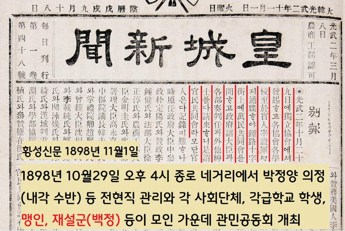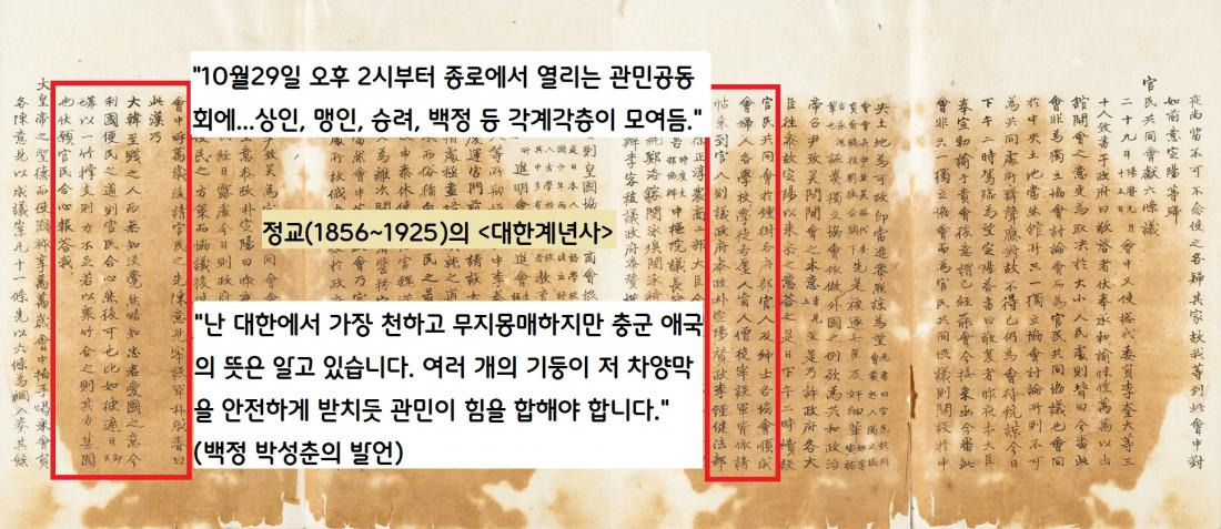 이날 관민공동회에서 발언기회를 얻은 백정 박성춘은 “내가 비록 신분은 가장 천하지만 충군애국하는 길은 알고 있다”면서 “관민이 힘을 합해야 한다”고 역설했다.