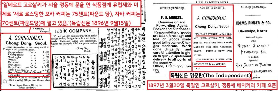 1896년 9월15일 독일상인 알베르토 고르샬키가 서울 정동에 새롭게 로스팅한 모카 커피와 자바 커피를 팔고 있다는 광고가 실렸다. 고르샬키는 1년 뒤인 1897년 3월20일 정동에 베이커리 카페를 열었다.