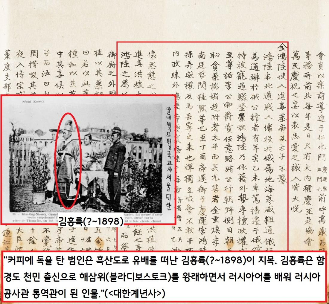 커피 독차 사건의 범인으로 김홍륙(?~1898)이 지목됐다. 김홍륙은 함경도 천민 출신으로 러시아어를 배워서 러시아 공사관 통역이 관 인물이다.|정교(1856~1925)의 <대한계년사>에서