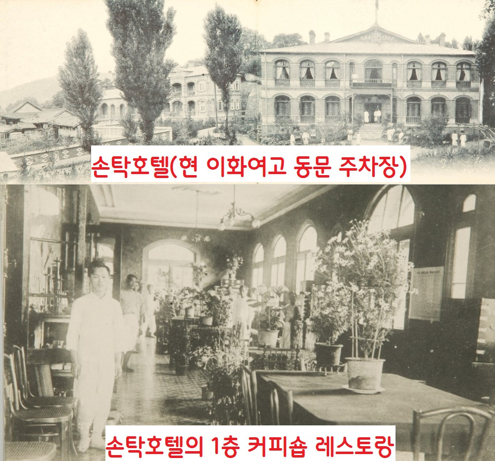 손탁은 1898년 러시아공사관 정문 왼쪽에 건물 한 채를 받은 뒤 1902년에는 건물 맞은편에 황실이 마련한 영빈관의 운영까지 맡았다. 그 영빈관을 손탁호텔이라 했다. 손탁호텔의 1층은 레스토랑 겸 커피숍으로 운영됐다.|국립민속박물관 소장 자료