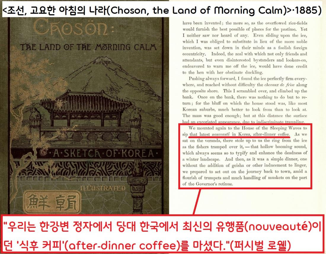 1883년 말 조선을 방문한 미국 천문학자 퍼시벌 로웰은 1884년 1월 한강변에서 경기도 관찰사로부터 식사대접을 받고 당대 조선의 최신 유행인 ‘식사후 커피’를 마셨다고 전했다.|로웰의 <조선, 고요한 아침의 나라>(1885)에서
