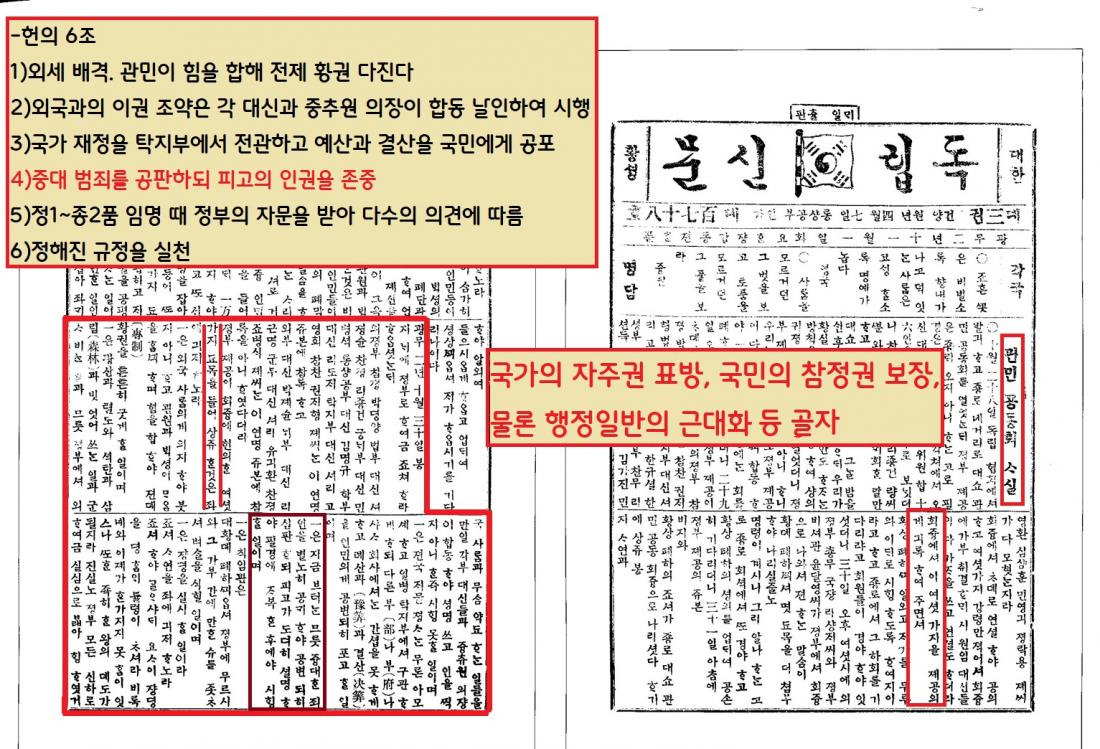 이 자리에서는 국가의 자주권 표방, 국민의 참정권 보장은 물론 행정일반의 근대화 등을 골자로 한 ‘헌의 6조’가 채택되었다.