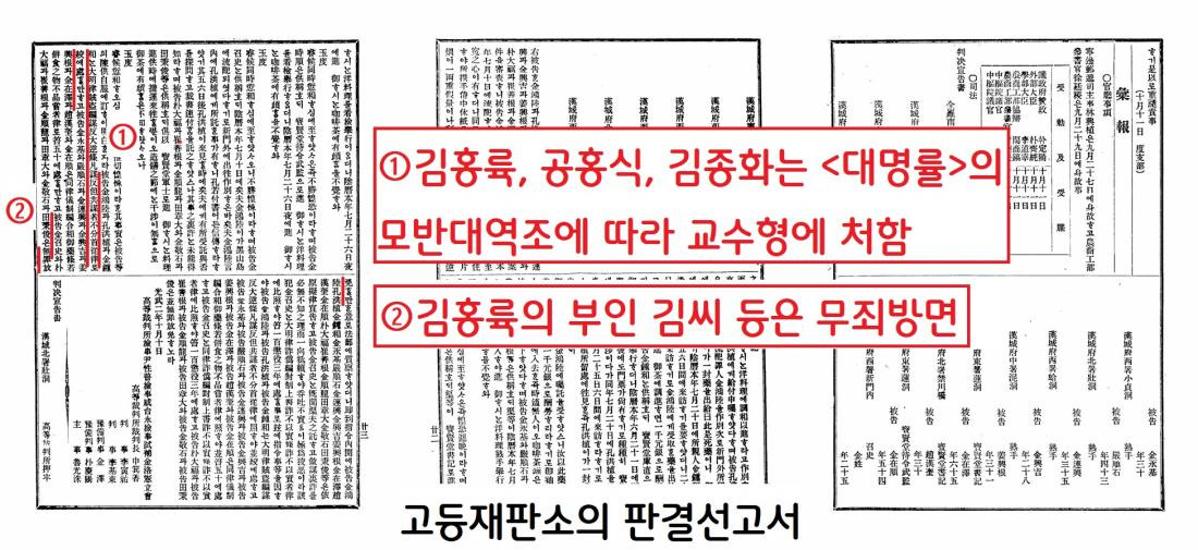 그런데 고등재판소의 판결에 대해 법부대신 신기선은 “부인 김씨는 남편의 음모를 모를리 없는데도 자백하지 않았으니 태형 100대, 징역 3년형을 내려야 한다‘고 이의를 제기했다.