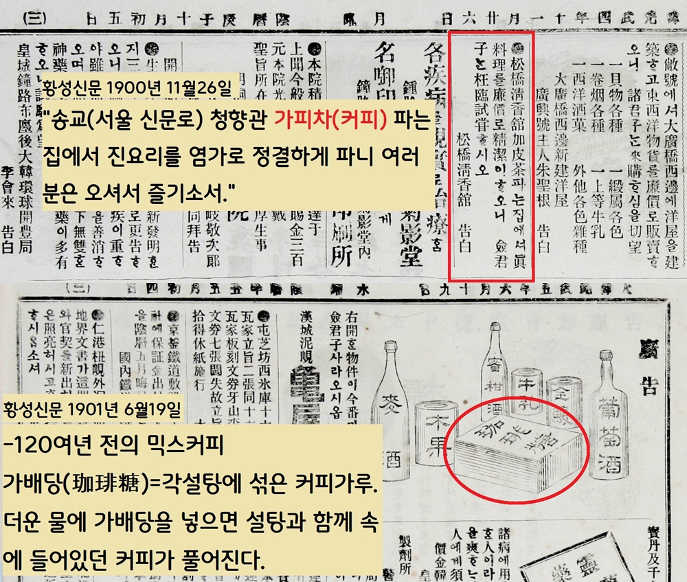 황성신문 1901년 6월19~21일자에 각설탕 속에 커피가루를 넣은 가배당 광고가 나온다. 더운 물에 가배당을 넣으면 설탕과 함께 속에 들어있던 커피가 풀어진다. 영락없는 믹스커피이다.
