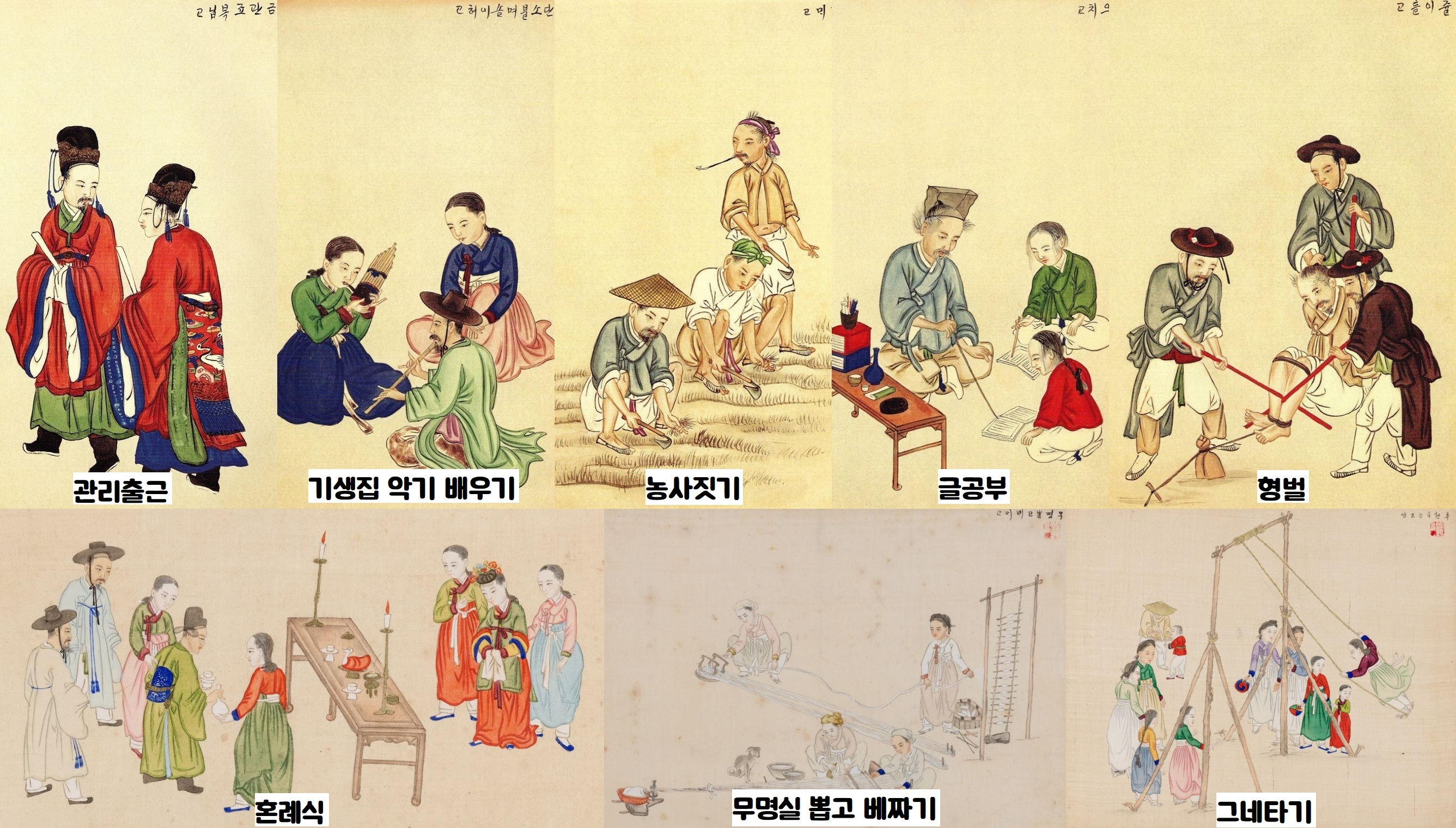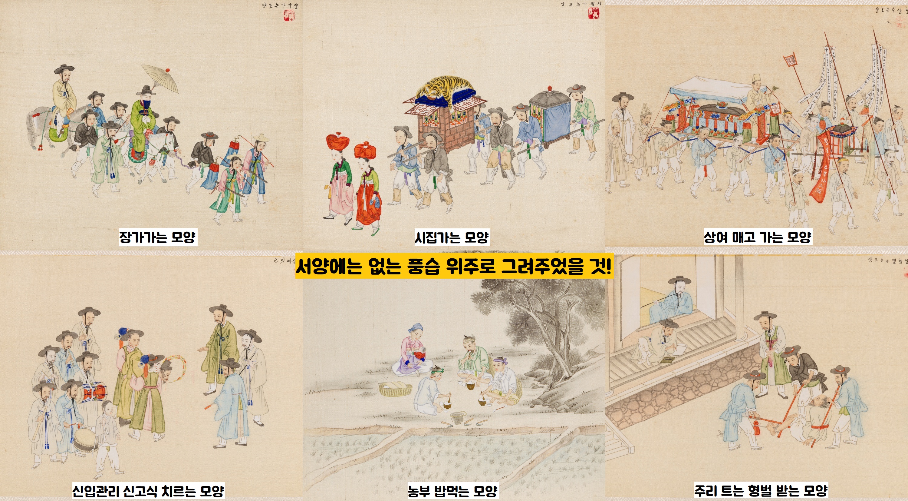 세트 마다 각종 민속놀이와 가내 수공업, 농업, 객주, 서당, 기생, 형벌, 장애인, 무속, 혼례, 상례, 관리 행차 등 당대 조선의 생활상을 일별할 수 있는 다양한 주제를 다뤘습니다. 특히 그림의 주제를 부각한 사실적인 묘사가 돋보입니다.