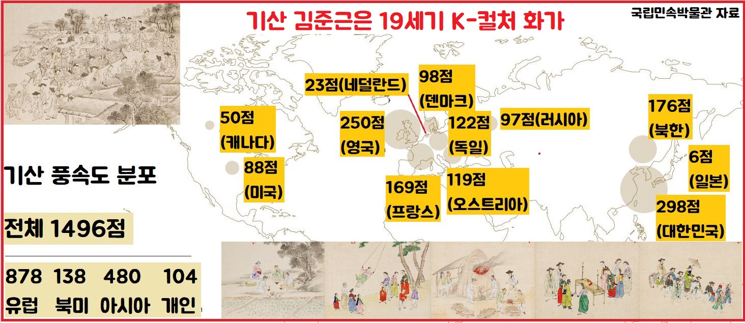 기산의 그림은 유럽 878점, 북미 138점, 아시아 480점, 개인소장 104점 등 전세계에 무려 1600점 정도 퍼져있습니다. 한마디로 19세기를 풍미한 ‘K-컬쳐 작가’라 할 수 있죠. 주요 소장처를 볼까요.