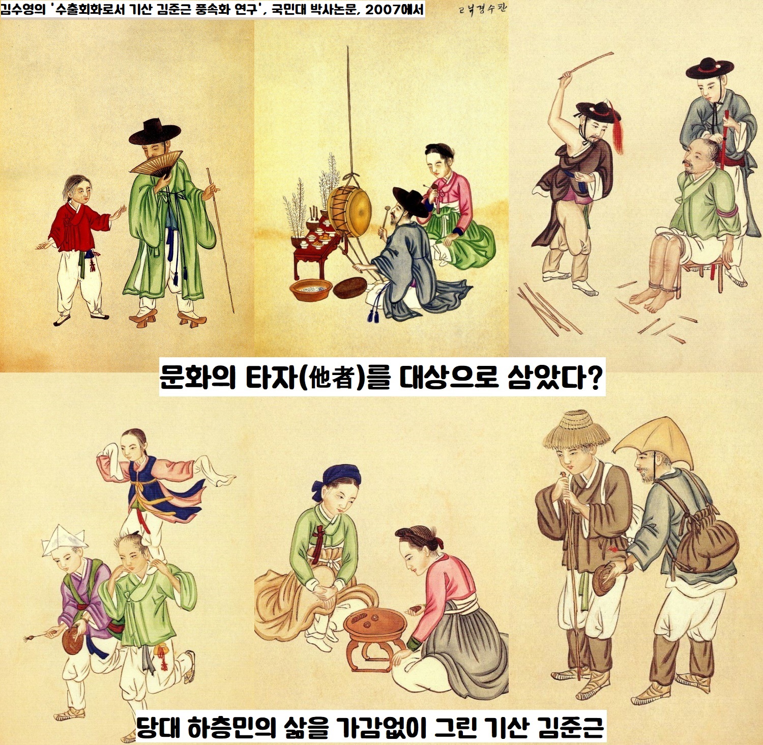 이것이 ‘우리의 화가(기산 김준근)가 우리(조선)를 그렸음에도 불구하고 성큼 다가설 수 없는 느낌이 들 수밖에 없다’는 이유라는 겁니다. 저는 이 연구자의 시각에 대체로 공감하고 있습니다.