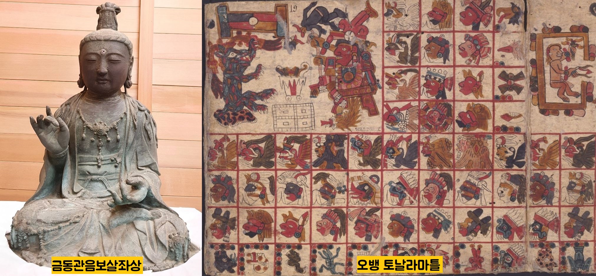 ‘토날라마틀’(달력)은 멕시코 원주민인 아즈텍인들의 별자리와 점성술을 상징하는 그림을 13개 용설란 껍질에 그려넣은 문서입니다. 이 문서는 여러 경로를 거쳐 1802년 멕시코에 머물던 프랑스 유물학자 장 프레데릭 발데크 등의 수중에 들어갔습니다. 발데크는 1840년 고문서를 프랑스로 반출한 뒤에 천문학자 조제프 마리우스 오뱅(1802~1891)에게 2만 프랑에 팔아넘겼습니다.