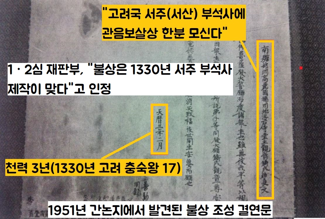 재판부는 일단 “1330년 서주(서산의 옛 명칭)에 있었던 부석사가 이 보살상을 제작했다”는 사실은 인정했습니다.