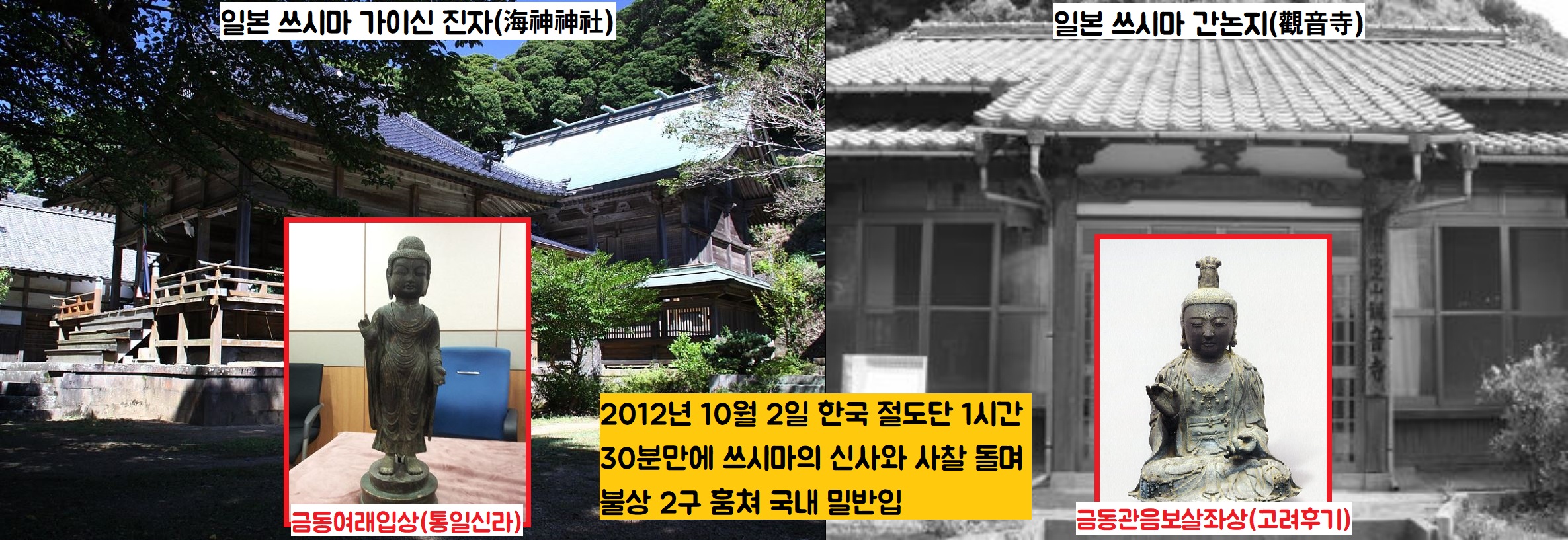 2012년 10월 2일이었습니다. 쓰시마(對馬島)를 찾은 한국의 절도범 일당은 1시간 반 만에 가이진 진사(海神神社)의 금동여래입상(통일신라)와 간논지(觀音寺·관음사)의 금동관음보살좌상(고려 후기)을 훔친 뒤 국내로 밀반입했습니다.