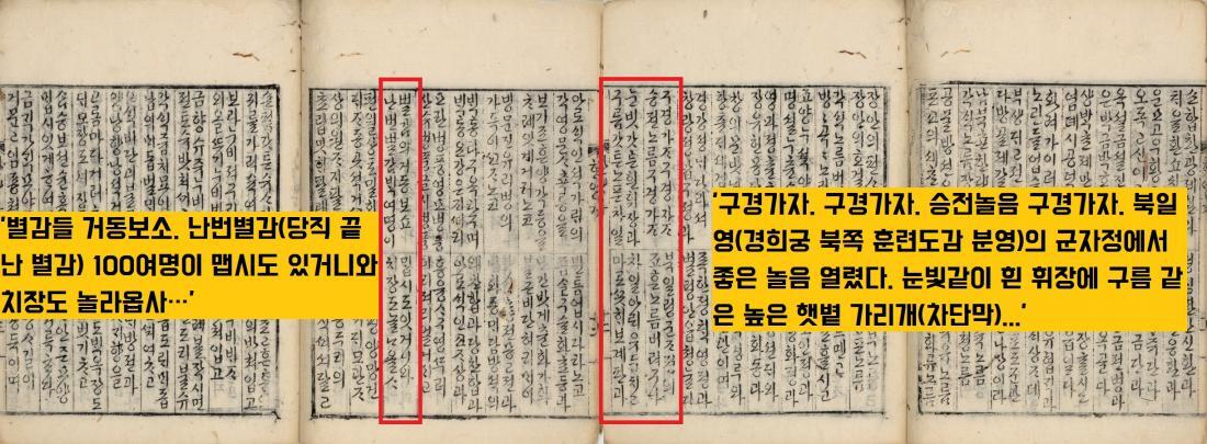 ‘구경가자 구경가자’로 시작되는 <한양가>의 ‘승전놀음’은 북일영(경희궁 북쪽 훈련도감 분영)의 정자에서 열렸다.