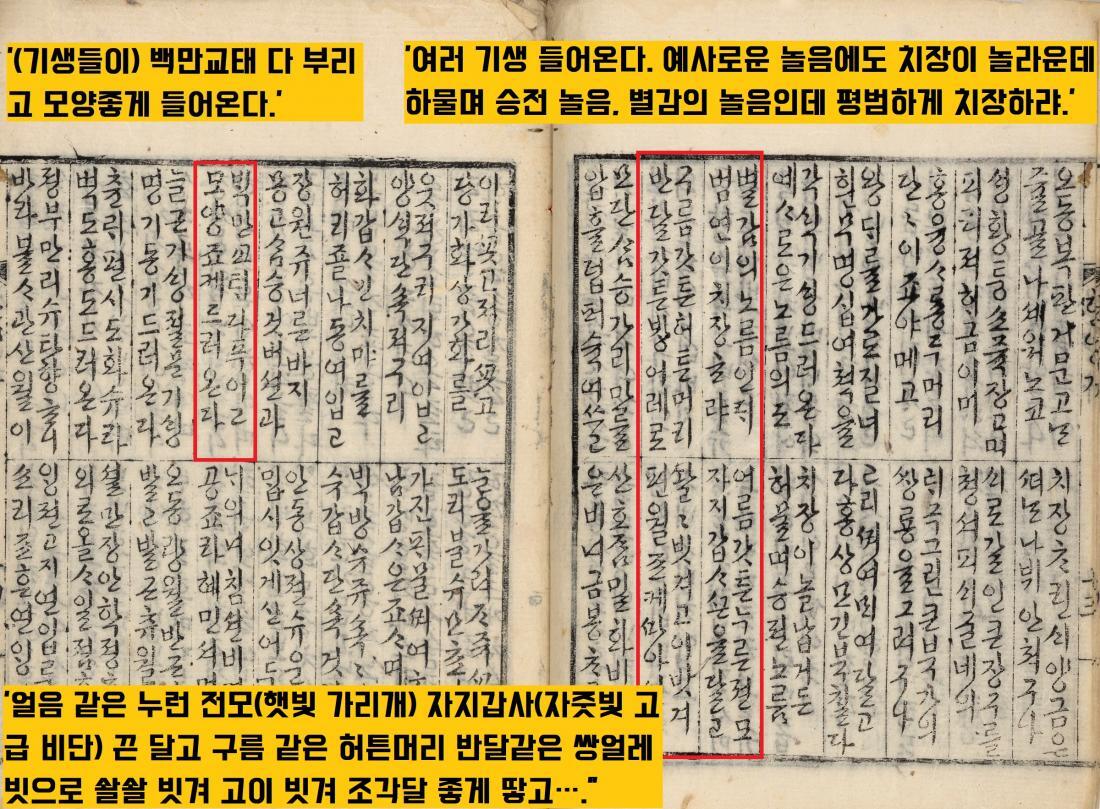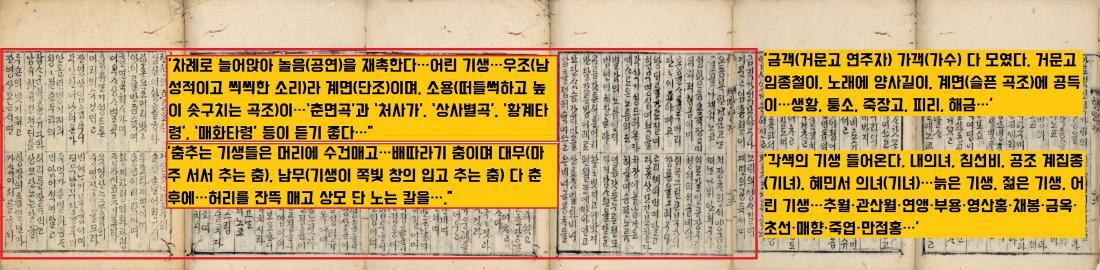 “각색 기생 들어온다. 예사로운 놀음에도 치장이 놀라운데 하물며 승전 놀음, 별감의 놀음인데 평범하게 치장하랴.”