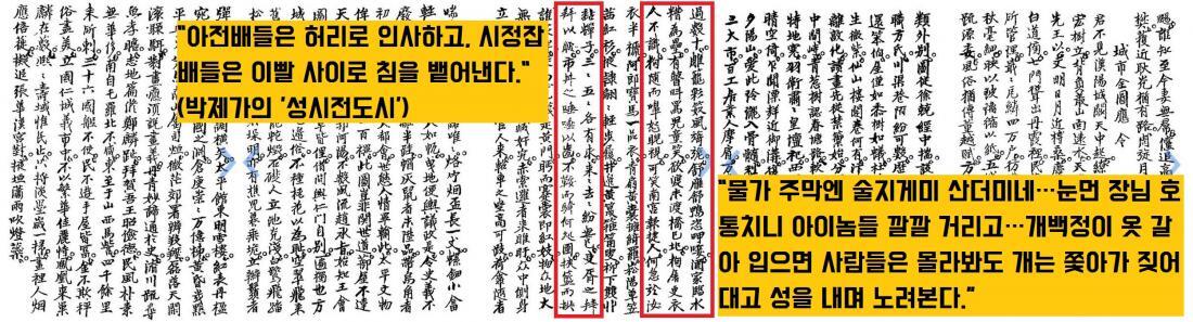 서울의 뒷골목 풍경을 생생하게 표현했다지만 작자들은 거개가 사대부 출신이었다. 게다가 ‘성시전도시’는 한문시다.