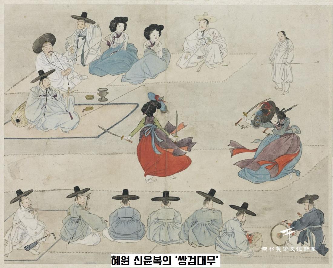 “기생들은…(영산회상곡의) 웃영산·중영산·잔영산 입춤(춤꾼의 감정에 따라 자유롭게 추는 춤)추니…배따라기 춤이며 대무(마주 서서 추는 춤), 남무(기생이 쪽빛 창의 입고 추는 춤) 다 춘 후에…허리를 잔뜩 매고 상모 단 노는 칼을….”