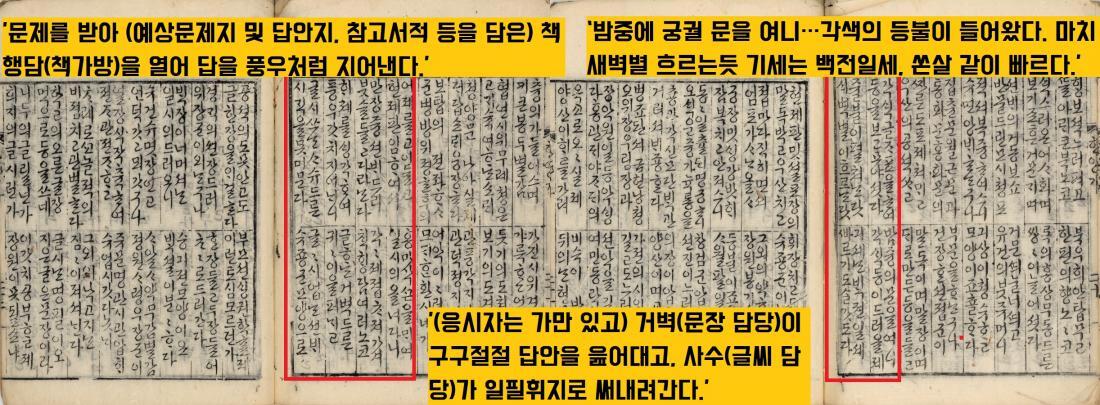 “옆에 앉아있던 거벽(문장 담당)이 구구절절 답안을 읊어대고, 사수(글씨 담당)가 일필휘지로 써내려간다.”(<한양가>)