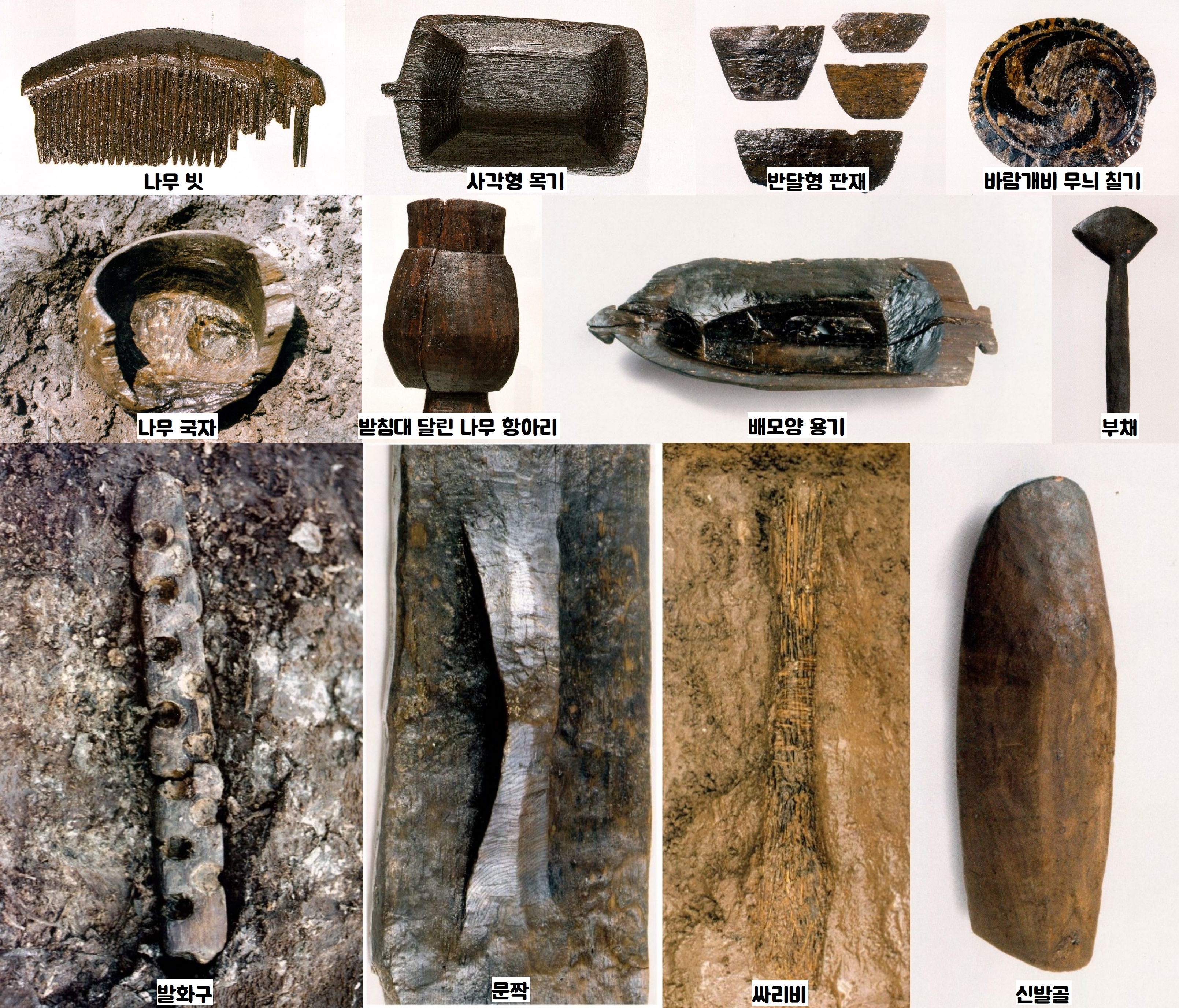 또한 발화구와 문짝, 신발골, 나무칼, 괭이, 절구공이 등의 목기류와 다양한 칠기류, 삿자리, 그물망, 새끼, 빗자루 등이 줄줄이 출토됐다. 베틀부속구인 바디와 실감개 등도 나왔다. 바디(베를 짤 때에 베의 날을 고르게 하는 도구)는 동아시아에서 출토된 것 가운데 가장 완벽하게 보존된 국보급 유물이라는 평을 받았다.