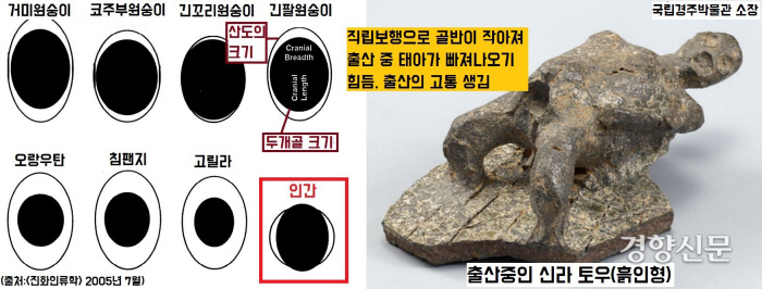 ‘두발 직립 보행’의 후유증이 지금까지 남아있죠. 다리, 허리, 무릎, 엉덩이, 발바닥 등 두 발 걷기에 동원된 곳들은 통증에 시달리게 되었죠. 대표적으로 디스크질환이 나타나잖습니까. 또 직립보행을 하게 되니 골반이 좁아졌죠. 그래서 태아가 나오는 산도도 좁아졌고, 따라서 출산의 고통도 생겼습니다.