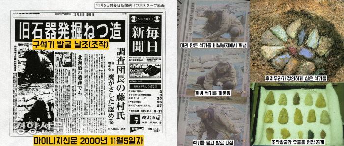 이른바 ‘구석기 유적 조작 사건’이었습니다. 고고학자인 후지무라 신이치(藤村新一)가 미야기현(宮城縣) 쓰기다테초(築館町) 가미타카모리(上高森) 유적 발굴 현장에서 가짜 석기를 파묻는 장면을 ‘몰래카메라’로 폭로한 겁니다,