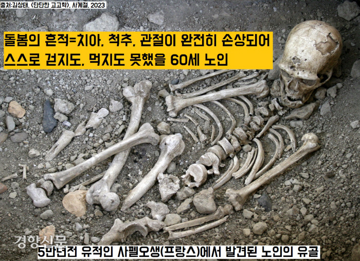 5만년전 프랑스 샤펠오생 동굴유적에서는 60세 전후의 노인 유골이 확인되었는데요. 그런데 출토된 유골 상태를 보니 치아는 거의 남아있지 않았구요. 뼈의 척추와 관절마디 역시 염증으로 손상되어 있었습니다. 스스로 걷지도, 음식를 먹지도 못했을 겁니다. 그렇게 천수를 다한 노인을 정성껏 보살폈고, 사후 장례까지 치뤄주었음을 알 수 있어요.