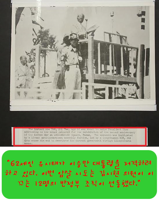 이승만 대통령의 뒤에서 권총을 겨누고 방아쇠를 당기는 인물이 보입니다. 호호백발 노인이죠. 범인은 당시 예순 두살 된 ‘유시태(1890~1965)’라는 분이었는데요. 그런데 그 분은 일제강점기 때 의열단원으로 활약했던 독립투사였답니다. 이 저격사건은 미수에 그쳤는데요. 방아쇠를 두 번이나 당겼지만 발사되지 않은 겁니다. 그런데 이 사진을 허투루 넘기면 안됩니다. 사진 밑에서 타이핑 된 설명문을 읽어보십시요.