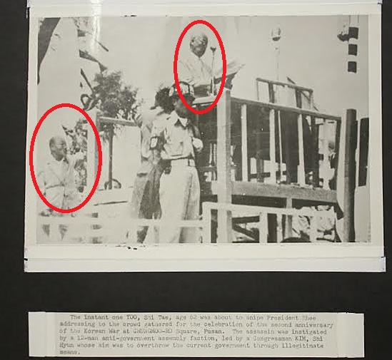 이승만 대통령의 뒤에서 권총을 겨누고 방아쇠를 당기는 인물이 보입니다. 호호백발 노인이죠. 범인은 당시 예순 두살 된 ‘유시태(1890~1965)’라는 분이었는데요. 그런데 그 분은 일제강점기 때 의열단원으로 활약했던 독립투사였답니다. 이 저격사건은 미수에 그쳤는데요. 방아쇠를 두 번이나 당겼지만 발사되지 않은 겁니다. 그런데 이 사진을 허투루 넘기면 안됩니다. 사진 밑에서 타이핑 된 설명문을 읽어보십시요.