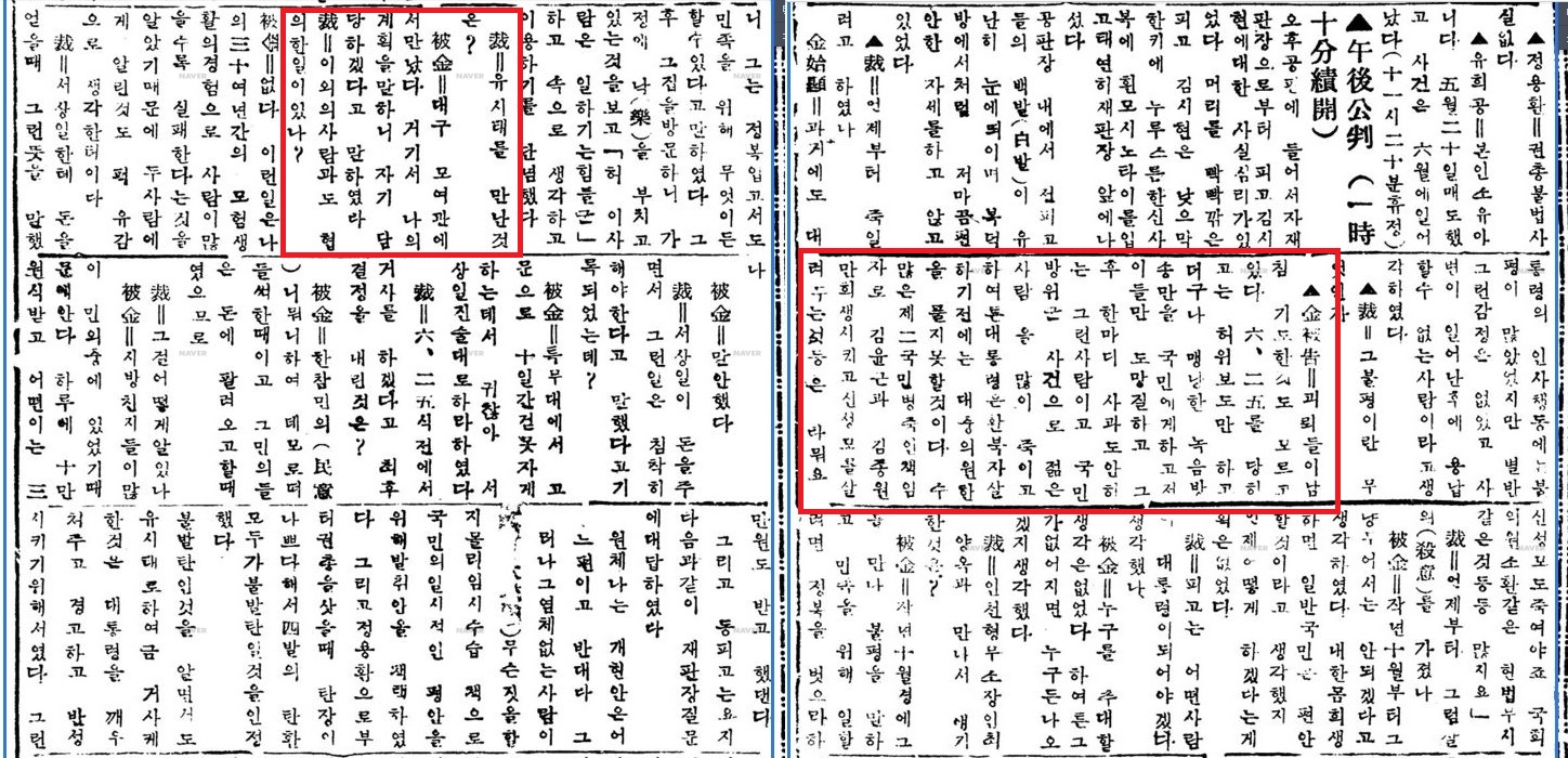 “현행범 유시태(62)를 취조한 바 전 민국당 국회의원 김시현이 유시태에게 권총사용법을 8회나 교습시켜…국회의원 신분을 이용하여 귀빈석에 함께 자리를 잡고 앉아있다가…, 대통령 훈화 도중 유시태는 배후 약 3m 거리에서 저격하고자 휴대한 권총(독일제 엘프르트)의 방아쇠를 두번이나 당겼으니 불발로 인해 목적을 이루지 못하고 체포됐다.”(<경향신문> 1952년 6월28일)