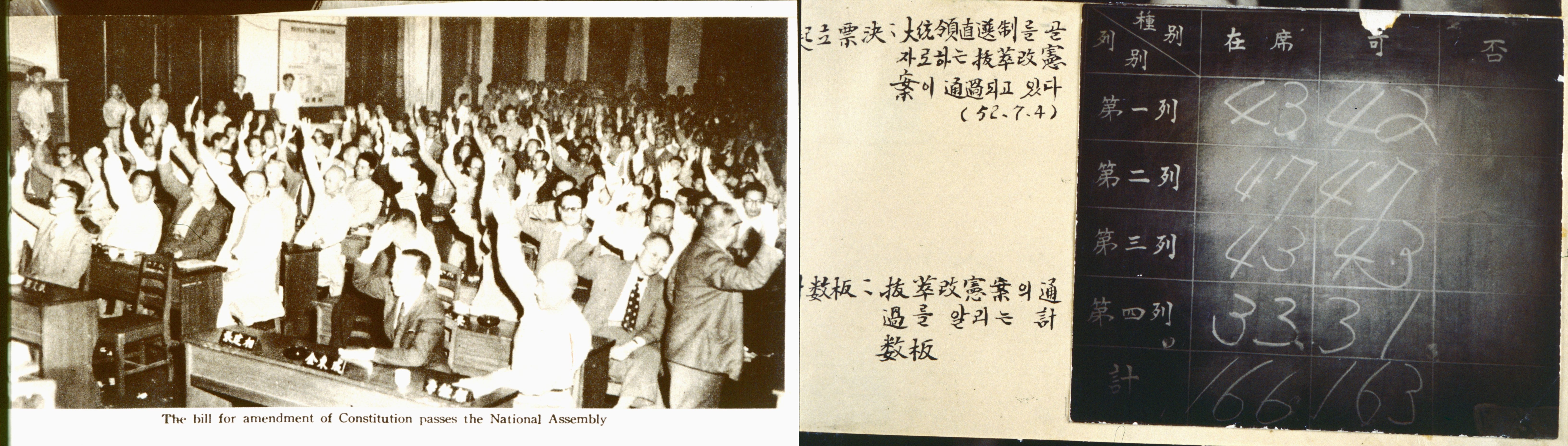 그 무렵 부산의 정치상황은 한 치 앞을 내다볼 수 없을 정도로 혼란에 빠져 있었습니다. 국회에서 대통령을 선출하는 간선제로는 절대 재선할 수 없을 것으로 판단한 이승만 정권은 대통령직선안을 국회에 제출합니다. 그러나 직선안이 1952년 1월 18일 압도적인 표차로 부결됩니다. 그러자 이승만 정권은 개헌안을 일부 수정해서 다시 국회에 제출하는데요. 이것이 발췌개헌안입니다.