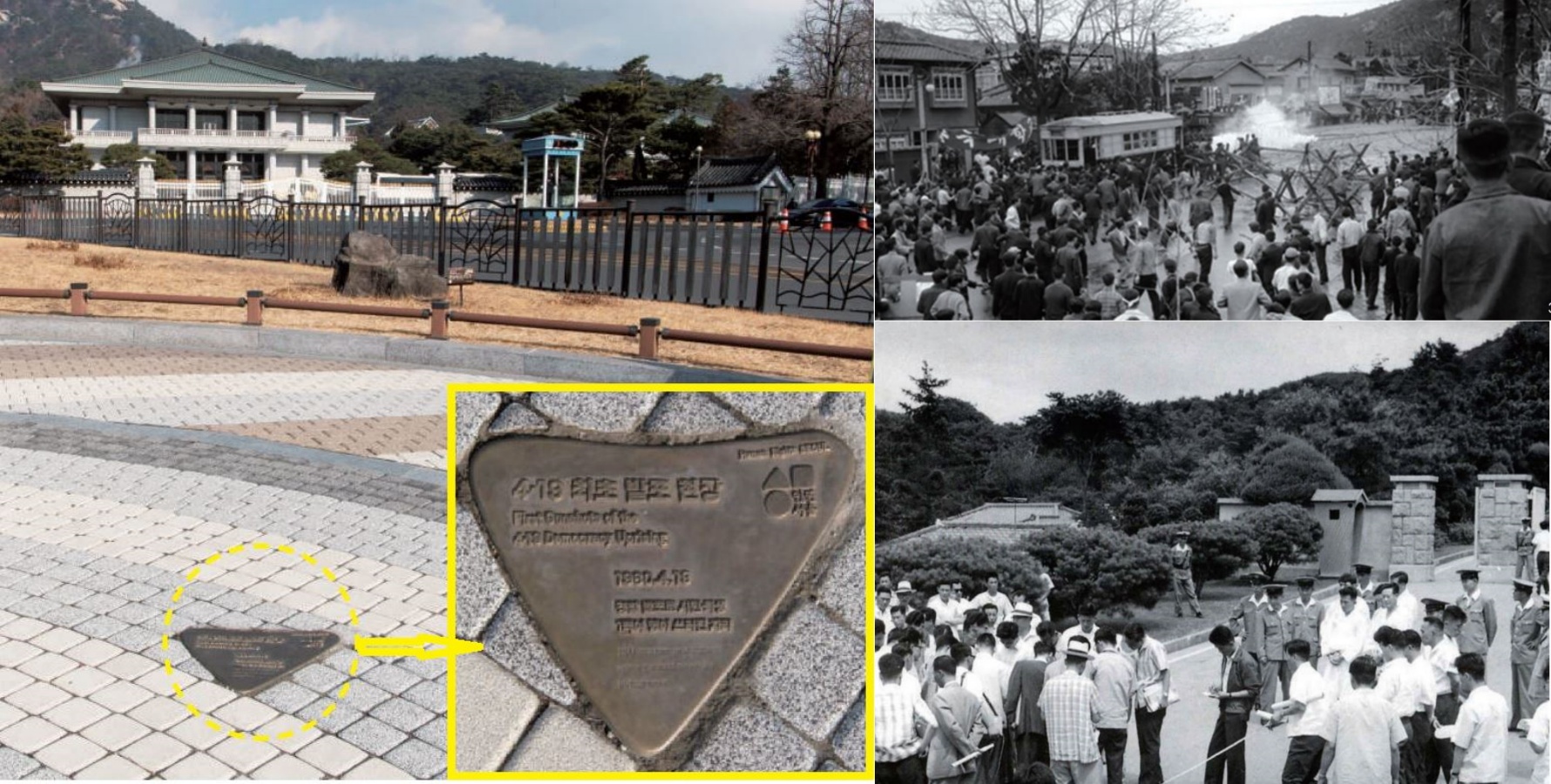 담장을 넘으려던 시위대 군인들은 이진호의 밀고에 따라 미리 대기하고 있던 친위대의 반격을 받는다. 사건의 후폭풍은 거셌다. 일본은 이 사건을 빌미로 히로시마(廣島) 감옥에 수감 중이던 명성황후 시해사건 주모자들을 증거 불충분으로 전원 석방했다. 청와대 앞길 서쪽에 자리잡은 분수대 앞도 유서깊은 역사의 현장이다. ‘4·19 최초 발포의 현장’임을 알리는 표지판(동판)이다.