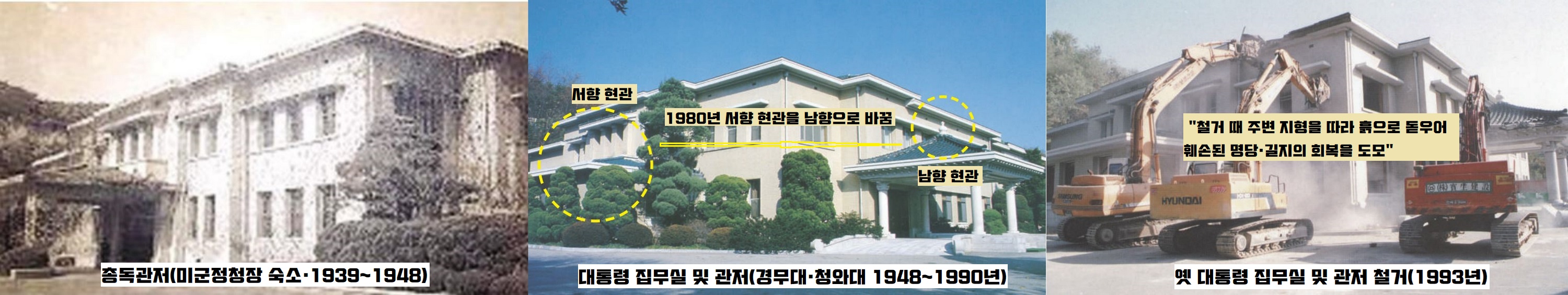 당시 노태우 대통령은 집무실이 좁다면서 100m 떨어진 곳으로 옮기고, 관저도 따로 조성했다. 그러나 ‘집무실 따로, 관저 따로’ 조성의 배경에는 풍수의 의미가 담겨 있었다. 공사를 끝낸 당시의 청와대 홈페이지는 “새로 완공된 본관은 옛 기맥을 되살린다는 뜻에서 북악산정(山頂)-경복궁-광화문-관악산을 잇는 축선에 세워졌다”고 설명했다.