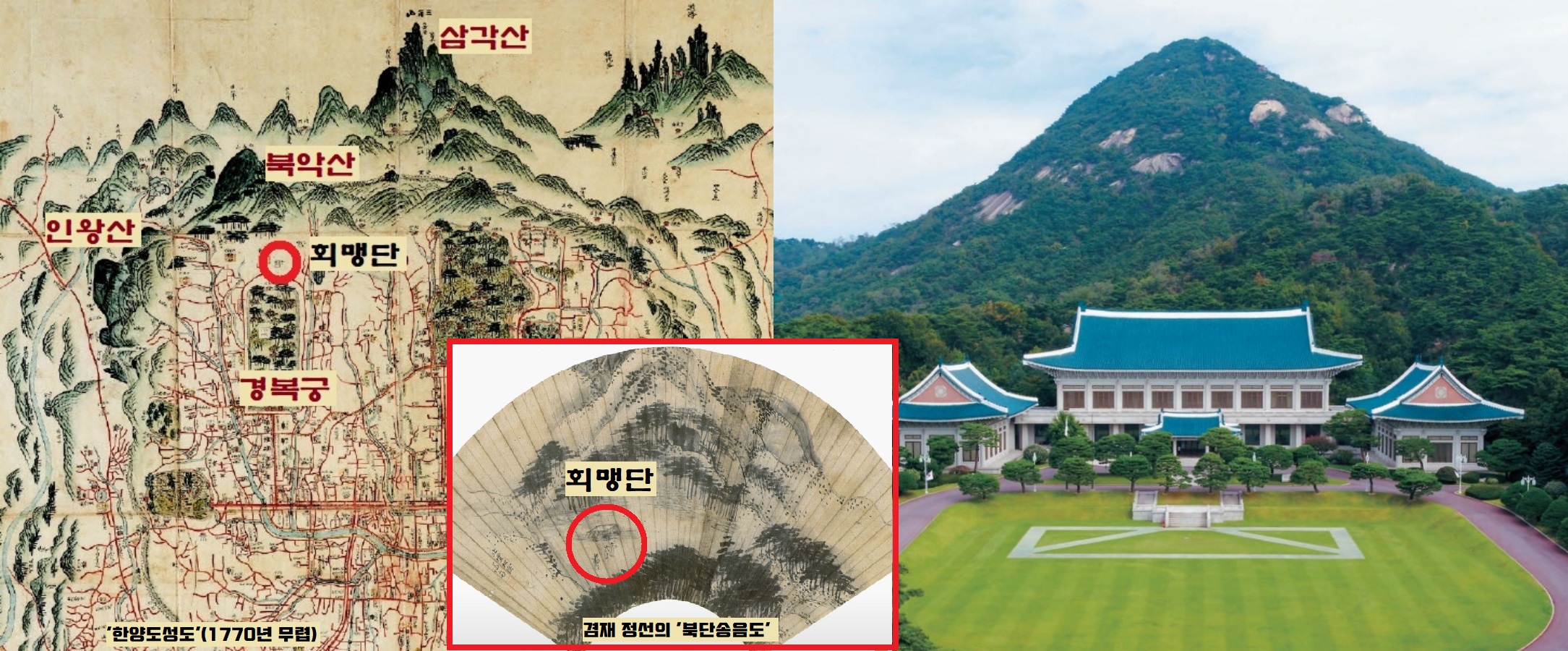 조선 개국과 함께 “좁은 고려 남경의 궁궐터 남쪽에 새 궁을 세운다”(<태조실록>)는 방침에 따라 경복궁이 건설된다. 남경 궁궐터(청와대터)엔 임금이 공신과 공신의 적장자들을 모아 충성서약을 받는 회맹단이 설치됐다.