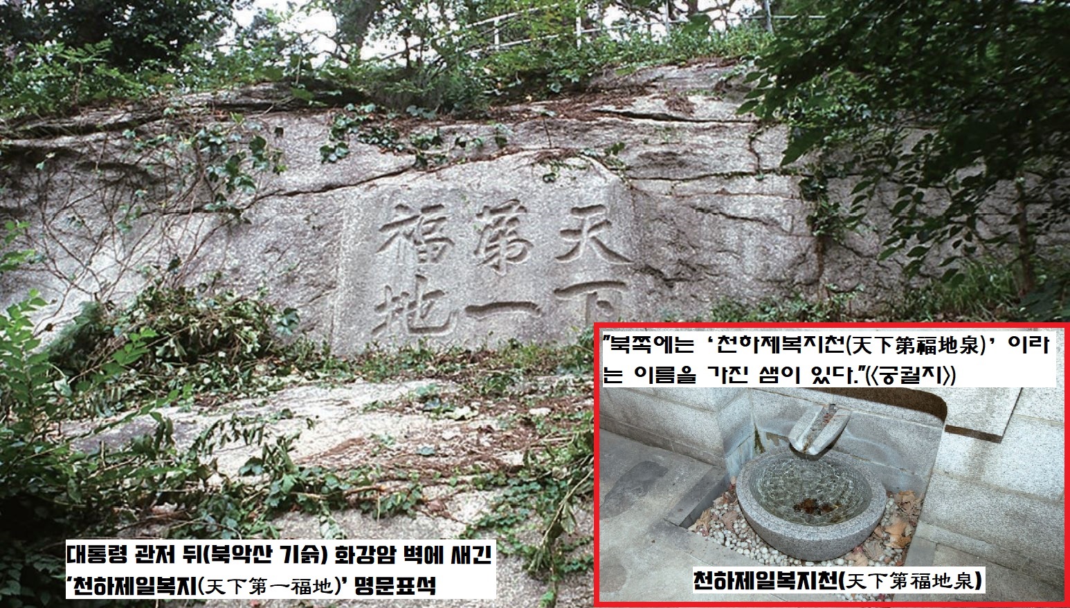 그런데 <궁궐지>(1907년)를 보면 “북쪽에는 ‘천하제복지천(天下第福地泉)’이라는 이름을 가진 샘이 있다”는 내용이 있다. 이 샘은 ‘천하제일복지’라는 글씨가 새겨진 바위의 아래와 대통령 관저 뒤쪽 사이에 있다.