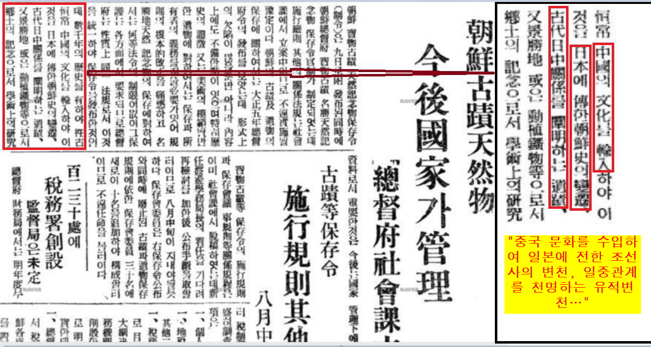 “중국의 문화를 수입하여 이것을 일본에 전한 조선사의 변천, 고대 일중(日中)관계를 천명하는 유적 등을 국가(일제)관리 하에 영구히 보존한다”고 했습니다.