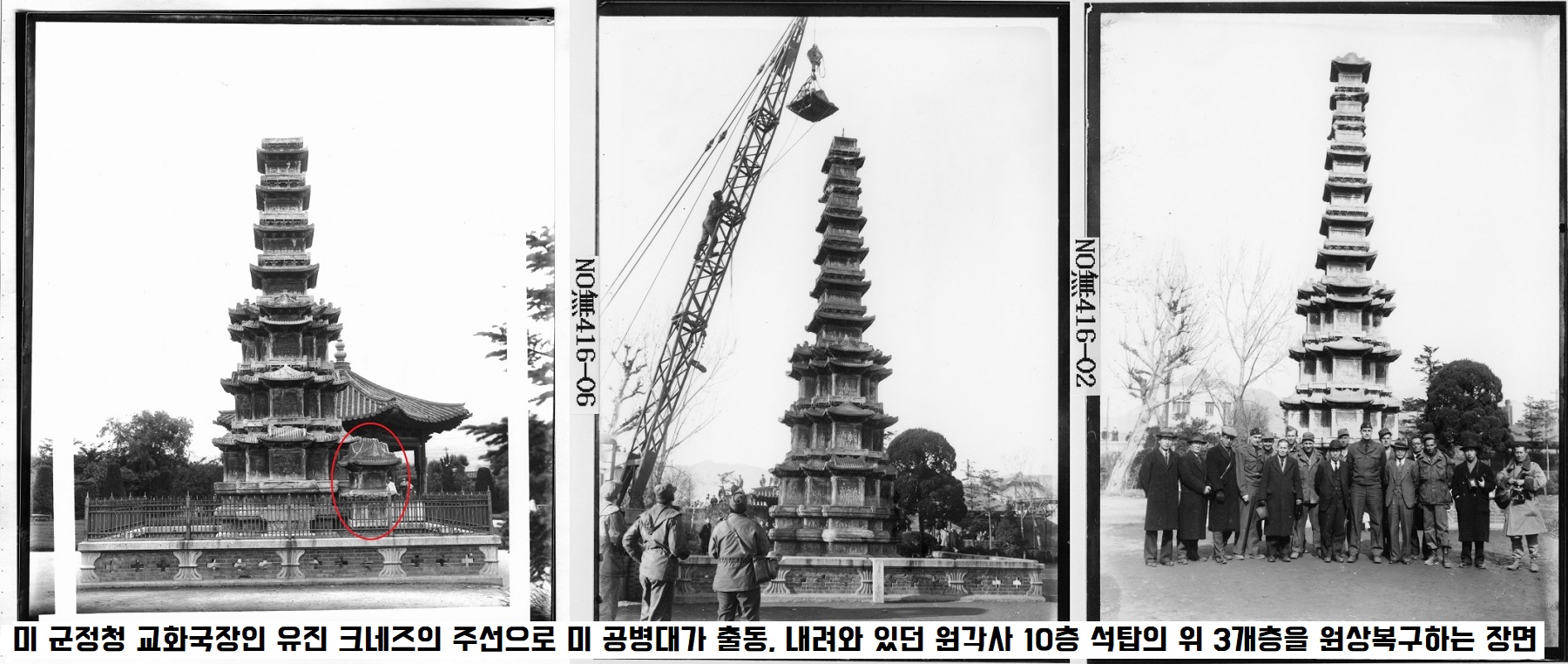 크네즈가 1946년 2월 ‘파고다 공원(현 탑골공원)’을 지나가다가 탑신의 윗부분 3층이 해체되어 땅 위에 방치되어 있던 탑(원각사 10층 석탑)을 보고 고개를 갸웃거립니다. 구전으로 임진왜란 때 왜장 가토 기요마사(加藤淸正·1562~1611)가 일본 반출을 위해 뜯었다가 무위에 그쳤다는 이야기가 퍼져있었죠. 크네즈는 곧바로 미공병대를 투입, 원래대로 복원해놓았는데요. 그는 “복원한 이 탑을 우호의 의미로 한국인들에게 선물하고 싶었다”고 회고했습니다. 크네즈에게 ‘파고다맨’이라는 애칭이 붙었습니다.
