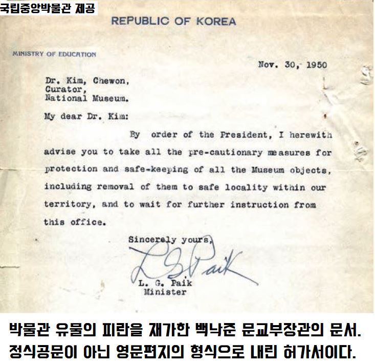 11월 말이 되자 김재원 관장은 주한미대사관의 부산 공보원장을 맡고 있던 유진 크네즈(1916~2010)에게서 “박물관 소장품들을 옮기는 것이 좋겠다”는 이야기를 듣습니다. 김 관장은 당시 백낙준 문교부 장관(1895~1985)을 찾아가 “유물의 부산 피란을 허용해달라”고 요청합니다.