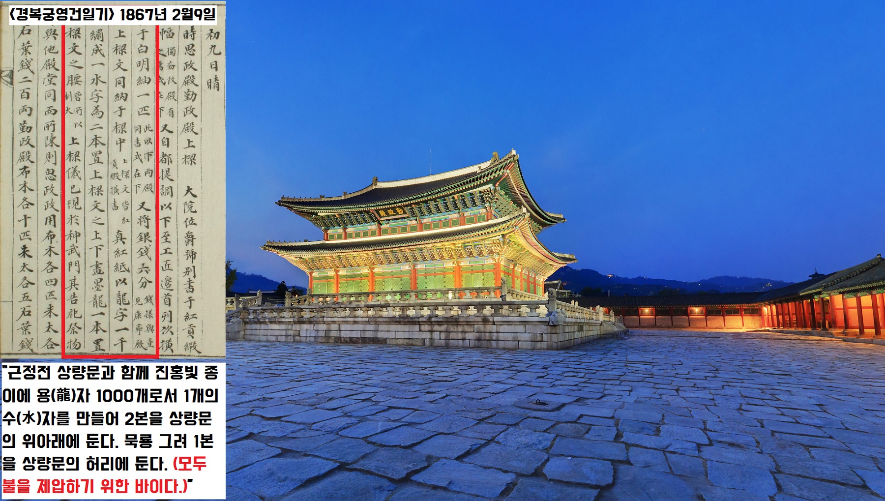 <경복궁 영건일기>를 보면 강녕전에도 상량문과 함께 수(水)자를 새긴 6각형 은판을 넣었고(1865년 10월 11일), 경회루에도 수은을 담은 병과, 은판, 수(水)자 부적 2장, 묵룡화 1장 등을 상량문과 함께 매납(경회루·1867년 4월 20일)했답니다.