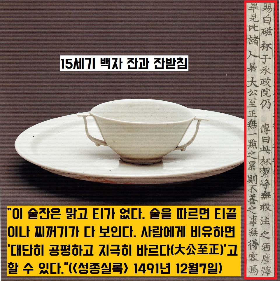 우선 성군의 으뜸과 버금인 세종(1418~1450)과 성종(1469~1495)이 그 순백의 의미를 알았던 것 같아요. “세종은 오로지 백자그릇만 썼다”(<용재총화>)고 했구요. 성종은 안료를 사용하지 않은 순백자 잔을 승정원에 하사한 뒤 이렇게 언급했습니다.