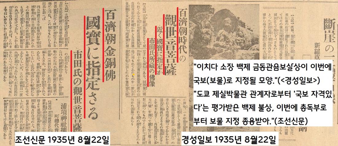 다시 2년 뒤인 1935년 8월22일 조선신문과 경성일보에 ‘이치다 소장 불상의 국보(보물) 지정’ 관련 기사가 나란히 실린다.
