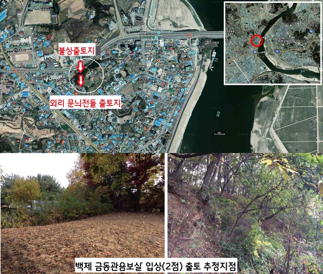 외리 출토 무늬 전돌 보고서의 도면과 현재의 인공위성 사진을 겹쳐 확인해보면 얼추 금동불상의 출토지를 특정할 수 있다. 부여 규암면사무소에서 남쪽으로 도로를 건너 자리잡고 있는 야트막한 구릉이 바로 외리 유적과 백제 보살상의 출토지가 포함된 능선에 해당한다.|이한상 대전대 교수 제공